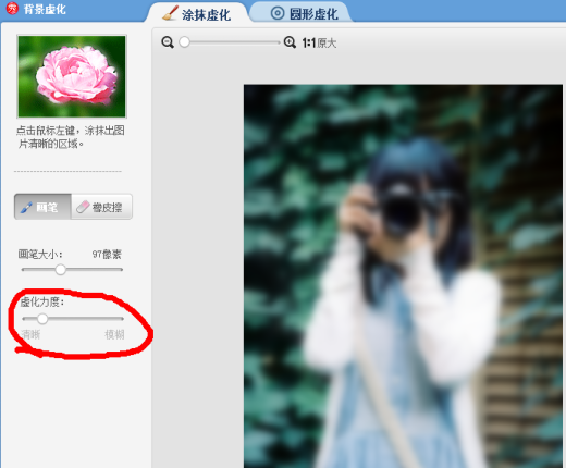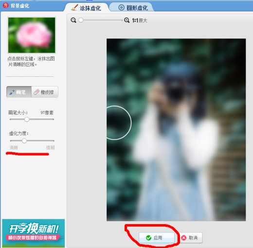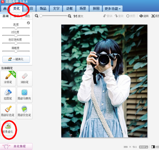 第一步,美图秀秀打开一张图片。如图所示:红圈圈里的就是你们要做的操作,美化→背景虚化