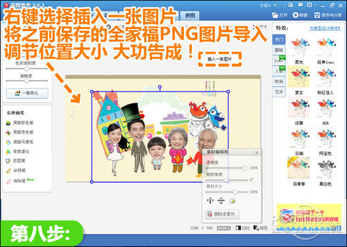 8、背景图制作好后,鼠标右键选择“插入一张图片”,将之前保存的全家福.PNG格式的图片导入进来,调节大小位置和背景衔接好,就大功告成了!