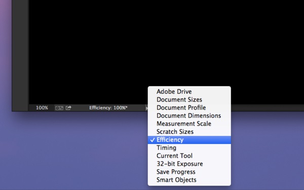 调出“效率”这一显示内容后,一般显示的会是“效率:100%”。而当该数值低于100%的时候,则意味着你并未分配足够的内存给PS,这时候PS会调用磁盘空间来支持运转,PS的图像处理运行自然会慢下来。如果你看到该数值已经低过90%了,那么你就该分配更多的内存给PS。当然,这里我们稍后再做详细解说。
