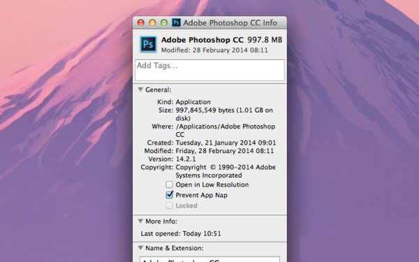 如果你使用了大量的自动任务或者动作时,你会发现PS运行地特别慢。原因何在?原因就在于Mac OSX 10.9版本推出的一个名为“App Nap”的功能。事实上,该功能一开始还是很有用的,在你进行多任务处理时,它可以帮你节省电量。不过该功能对于PS来说,却不是个好伙伴。