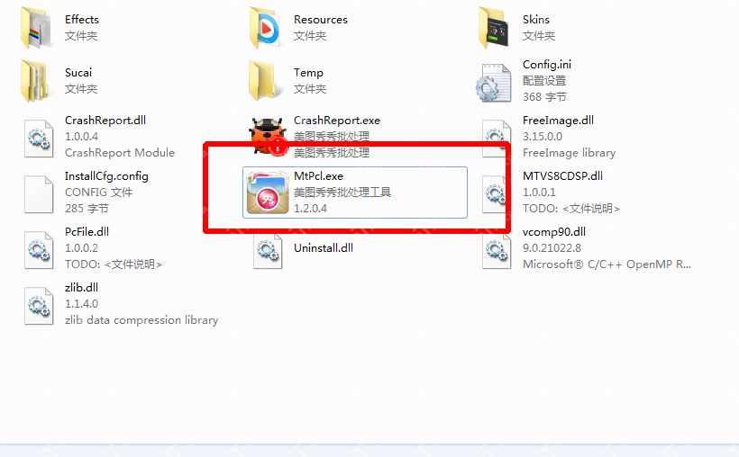 2、如果你下载的美图秀秀批处理;绿色独立版本,将下载的软件包解压,如下图所示,运行MtPcl.exe文件,进入美图秀秀批处理工具界面
