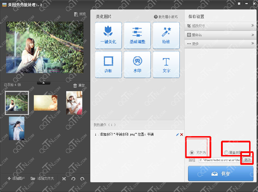 9、然后选择批量加水印之后图片保存方式(覆盖原图或是另存为新图片)以及图片保存的位置。设置好之后,点击保存。
