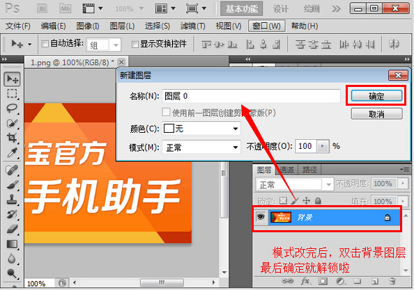 模式改完后,直接双击背景图层,最后确定就解锁了。