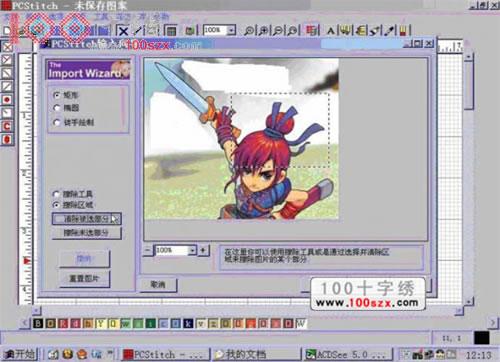 还可以选择擦除区域来进行擦除。当你选定为擦除区域选项时,用鼠标左键在图片上拖动来选定区域,通过改变左上方的3个选项来改变选取工具的形状。然后点“清除被选部分”(清除所选区域以内的图象)或是“擦除未选部分”(清除所选区域以外的图象)