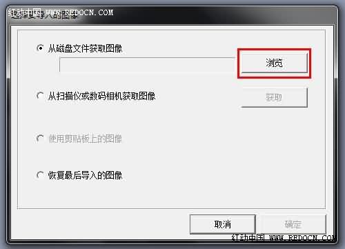 2、打开导入窗口,“从磁盘文件获取图像”为从自己的电脑中获取图像;“从扫描仪或数码相机获取图像”为从电脑以外的设备上获取图像,如相机,摄像头,扫描仪等,一般选择第一项,点击浏览,找到想要转换的图片双击打开