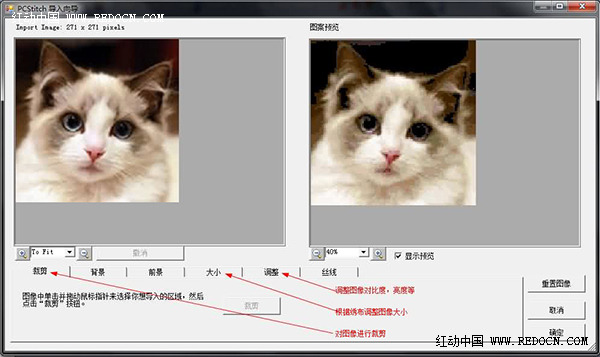 3、对图像进行调整:1)裁剪:根据需要裁剪图像2)大小:根据绣布调整图像大小3)调整:调整图像的亮度,对比度等4)显示预览:预览对图像调整后在绣布中的效果5)“+、-”:调整图像时对图像缩小或放大,不会改变图像的实际大小6)重置图像:还原到调整之前的状态,重新调整7)调整完成或不需要调整则点击确定。其它功能可自己尝试研究。