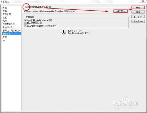 "编辑"—〉“预设”—〉“增效工具与暂存盘”—〉勾选“其它增效工具目录,选中photoshop/Adobe/Plug-Ins文件夹”—〉“选取”该文件夹即可~