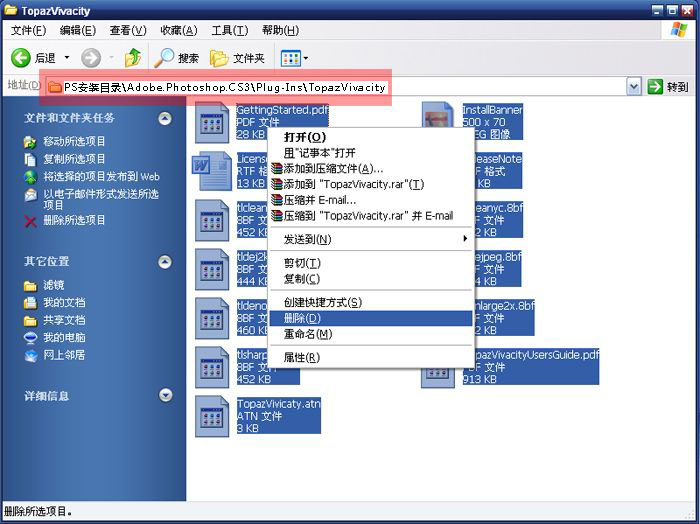 三、然后来到Photoshop滤镜目录下的TopazVivacity文件夹中,把该文件夹下的东西全部删除。(不一定要删除,只是为了方法使用)