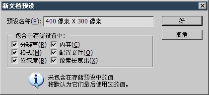 如果你手工输入了一些非预设的内容,比如把宽度设为400,高度设为300。如果这些设定在原先的预设选项中不存在的话,“储存预设”的按钮就可以使用了。所谓储存预设就是把你现在的一些设定保存下来,下次就直接可以从预设列表中找到,避免重复输入,如下图所示。