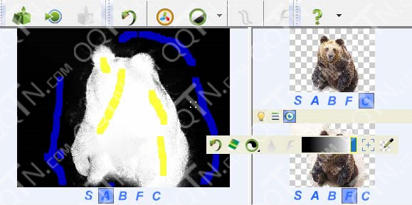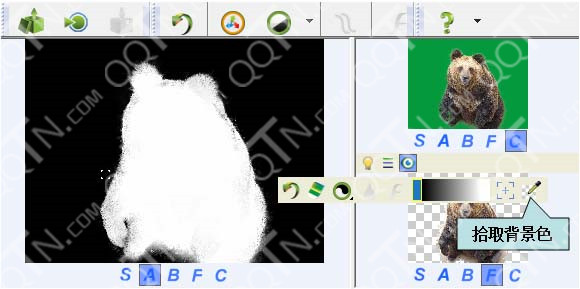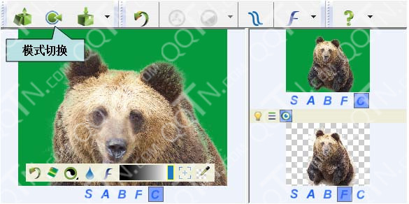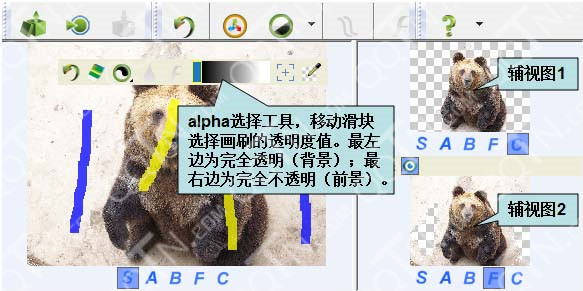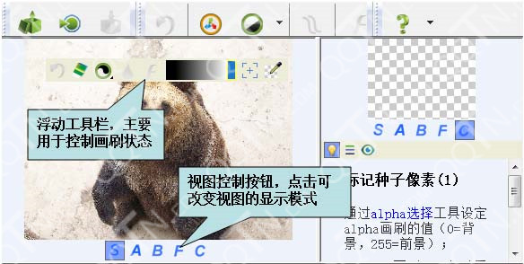 视图控制按钮,每个字母对应视图的一种显示模式(S=源图,A=alpha图,B=背景图,F=前景图,C=合成图);