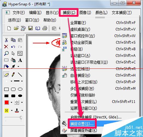 8、如果有时候大家截图时不想将鼠标截下来,怎么办呢?选择捕捉-捕捉设置。