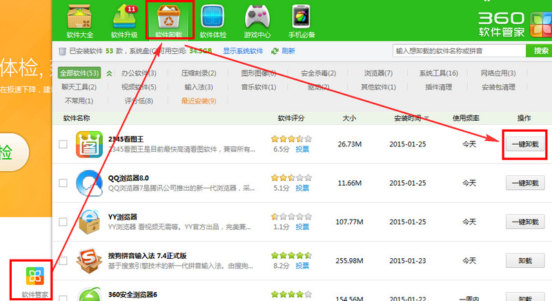 方法一:利用360安全卫士卸载点击软件管家,卸载软件
