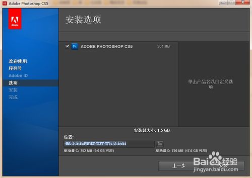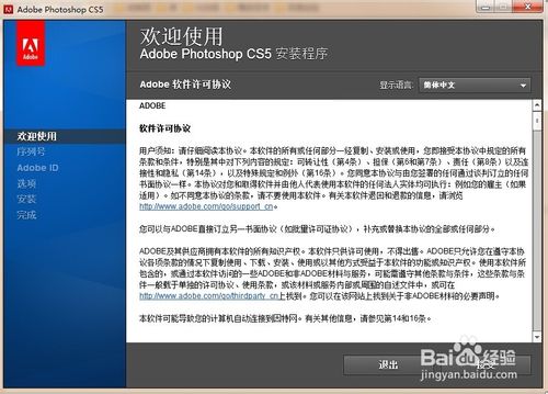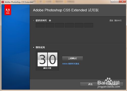 11、点击打开桌面的Photoshop CS5图标,弹出试用版对话框。选着继续使用,点击开始使用。弹出对话框点击下一步,就会打开Photoshop CS5软件。