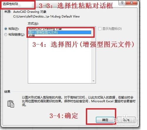 3、在任意区域右键(3-1),然后点击选择性粘贴(3-2),出现(3-3)所示的选择性粘贴对话框,选择(3-4)所示的图片(增强型图元文件),点击确定(3-5)。
