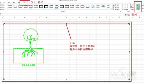 5、选择格式(5-1)---裁剪(5-2)---出现(5-3)的裁剪框,通过拉动鼠标就可以将图片多余的部分删除掉。裁剪后的 效果图如(5-4)所示。