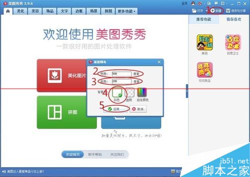 2、点击“新建”, 设置宽度:500像素,高度:200素,背景色:白色,点击“应用”。