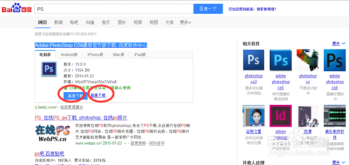 1、首先在百度搜索栏中输入:PS。然后点击搜索按钮,这时有关PS的全部和最新动态就会展现在你的面前,我们选择:Adobe PhotoShop CS6最新官方版下载。按你个人的下载条件来选择下载方式,(在点击下载按钮之前要在你自己正在用的这个浏览器中设置好下载文件存放的位置。)如图:
