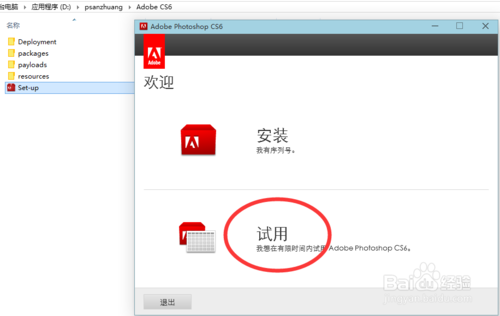 4、然后打开Adobe CS6文件,再双击Set-up图标运行安装程序,选择“试用”安装。(此时一定要断开网络,这是关键。)如下图: