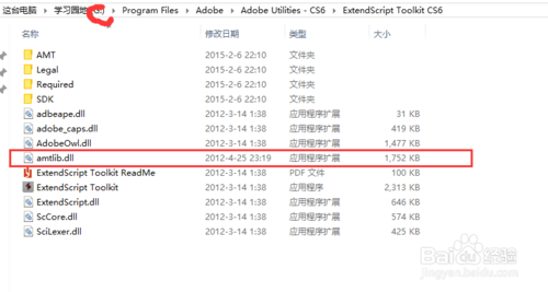 9、 根据你系统的要求选择32或64文件打开,然后复制其中的应用程序扩展文件:amtlib.dll。接着依次打开你系统安装区,如C区:C:\Program Files\Adobe\Adobe Utilities - CS6\ExtendScript Toolkit CS6,最后把复制的应用程序扩展文件amtlib.dll粘贴到这里。如图: