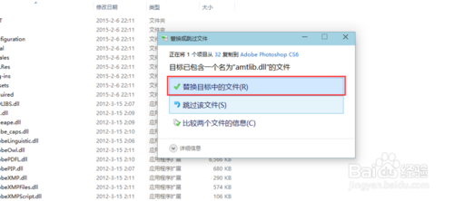 10、第二,再依次打开安装PS的目录,把你复制的文件amtlib.dll再次粘贴到:D:\psanzhuang\Adobe Photoshop CS6里,(注意:同样的一个应用程序扩展文件amtlib.dll,第一次粘贴在系统区,第二次是在安装PS的目录里,不可认为是一回事),这次是选择替换粘贴。如图: