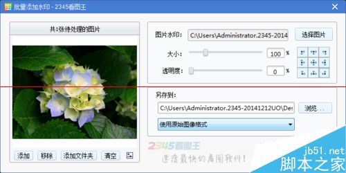 5、在右边的图片水印的后面点击“选择图片“这边就是选择想要添加的水印图片了。在本地的文件中找到自己想要添加的水印图片就可以了。另存的地址和格式都是默认的,自己也可以手动更改。