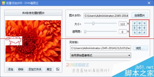 7、右上角的九宫格中有的箭头和位置标识。可以点击相应的位置来更改水印在图片上面的位置。