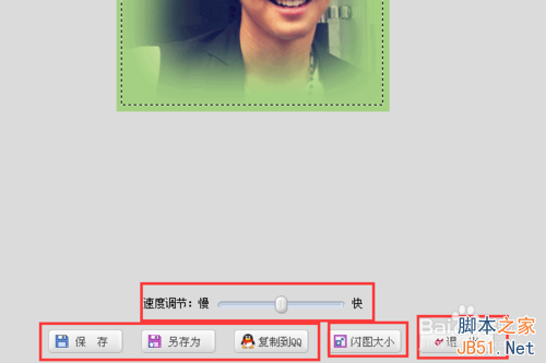 这时我们的图片就可以看到已经再闪了,在下方对闪动速度进行快慢调节,图片大小也可以调整,都调整好后,点击保存,另存为,或者复制到QQ都可以将图片以闪图方式保存出来。