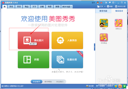 首先,我们需要下载美图秀秀pc端版,如果已经安装好,直接打开进入操作页面,点击美化图片。