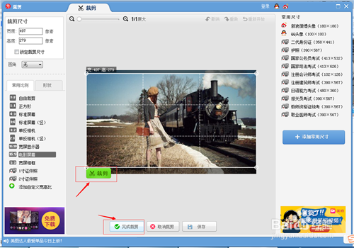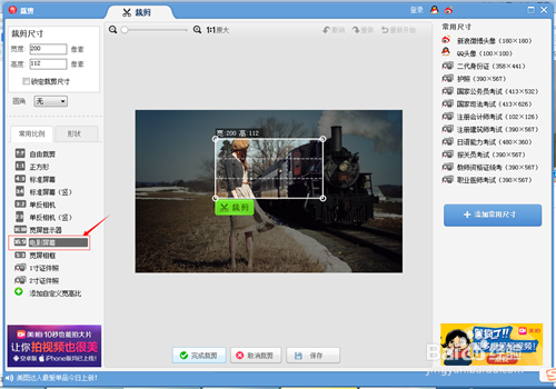 在截剪页面,左边框有很多尺寸屏幕可选择,点击选择“电影屏幕”