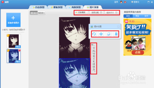 打开后,可拖动图片更改顺序,可设置横竖版,边框,尺寸,图片设置里可翻转,复制,删除图片。