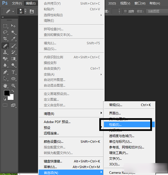 第一步:依次展开“编辑>首选项>性能”,如下图所示。