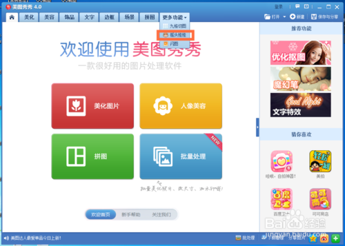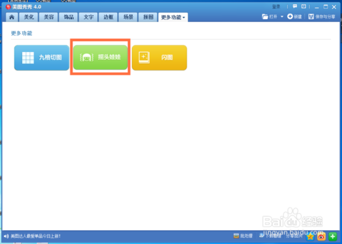 1、打开美图秀秀,注意电脑黑屏提示时要选“是”,选择“更多功能”中的“摇头娃娃”。