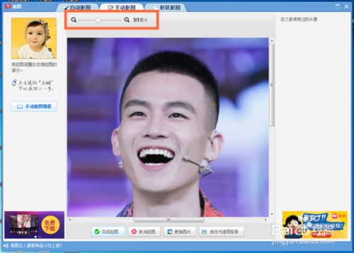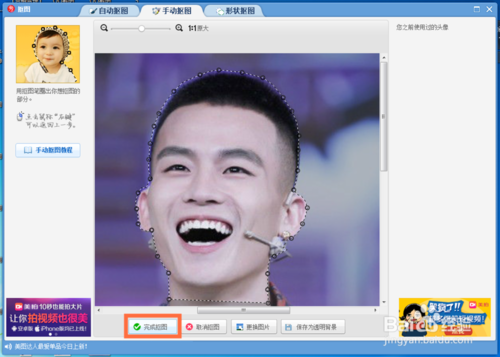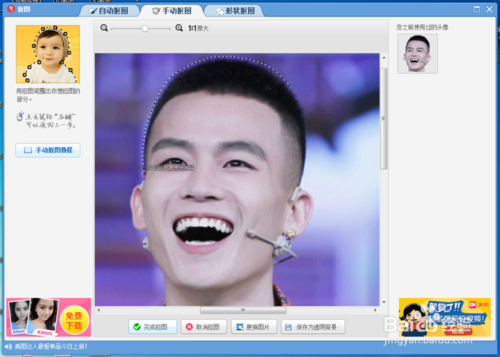 4、放大好之后,就开始抠图吧~用小铅笔在脸部的轮廓上抠图,扣完一圈后点回最开始的圆圈内,就完成了,点击”完成抠图“即可。这里要注意的是:美图秀秀抠图和photoshop不一样,没有磁铁的~