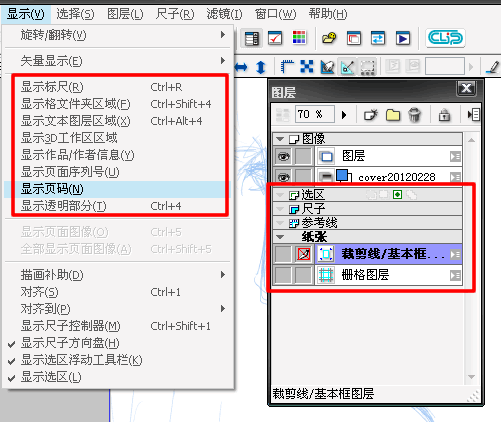 蓝色的B部分是用来放置起辅助作用的标准线啊、尺子啊这类东西的。如果新建尺子图层,那么就会在尺子图层部分多出一层,至于是什么尺子,那是自己决定的,这块牵涉到尺子工具的使用。我倒是不常用到尺子。 个人使用最多的是参考线图层,用来标示裁切线。