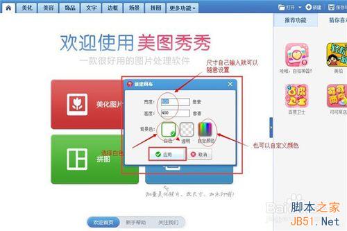 新建一个画布,画布大小自定义,按照自己的需求设置即可,可以选择白色背景,也可以自定义颜色。下面我选择的事白色背景,点击“应用”