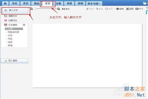 选择上面“文字”菜单栏,点击左边输入文字,在白色画布上输入静态文字,