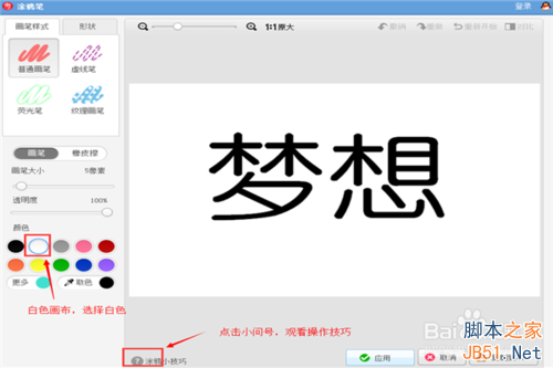 如下图,因为上面新建的画布是白色的,这里的涂鸦笔颜色也要选择白色,如果上面新建的画布是其他色,按照颜色一致选择涂鸦笔,点击下方的小问号,可以查看涂鸦笔操作技巧。
