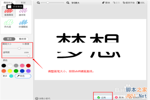 如下图,调整好涂鸦笔的大小,按住shift建同时涂鸦,可以涂鸦直线。一般从中间分割,可以根据文字的字体,选择美观性涂鸦。