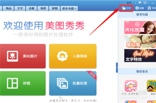 1、打开美图秀秀,然后单击“打开”添加一张图片。