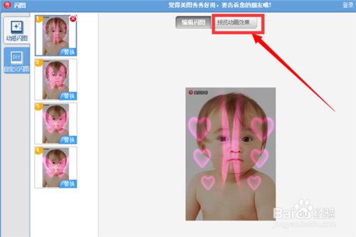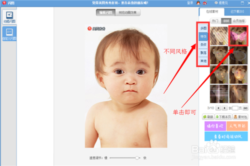 5、则会默认进入动态闪图的制作页面,右边有不同风格的闪图可供选择,单击闪图即可应用到当前的图片上。