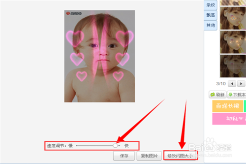 7、我们可以看到图片下面有一个速度条,你可以通过拖动它来改变闪图的快慢,也可以单击“修改闪图大小”来修改图片的尺寸。