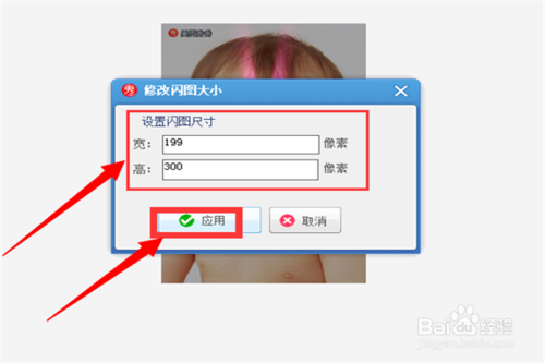 8、单击“修改闪图大小”之后,你就可以在如下框中自由输入宽高的像素值,然后单击“应用”即可。