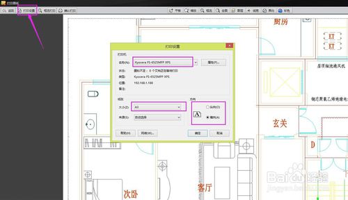 再选择左上角的打印设置,选择打印机和合适的纸张,我选的是A3纸横向。设置好后,图纸会变成黑白色。