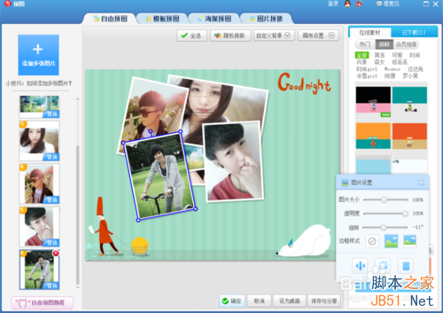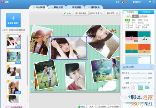 6、这时我们鼠标左键任意单击一张图片,图片右边就会出现一个相关调整的工具,我们拉动相关选项的小圆圈就可以调整图片的大小,透明度,旋转图片,同时还可选择边框样式,我们根据自己的需要进行自行调整就可以了。