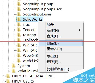 同样的方法在第三个注册表信息中找到所有与SW有关的文件,并删除。这样注册表里的SW文件就可以彻底删除了,再次安装软件就应该不会出现上述问题了。