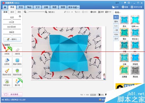 8、上一步点击保存之后,文件夹中的图片就变成处理过的图片了。我们再用美图秀秀打开刚刚保存的图片,图片上有一个画了弧度的弯曲线,继续点击左下方的“涂鸦笔”。