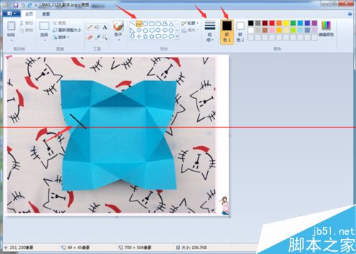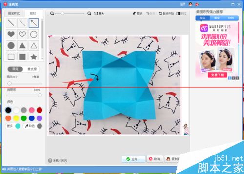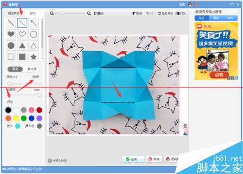 3、画虚线也是和画实线的方法是一样的。选择“形状”,然后点击形状下面的“虚线”标志,调节画笔大小、透明度和颜色,直直的画一道就好了,然后保存。这里要提醒大家的是,如果是在一张图片上或者是整套折纸图片中,最好用一样的画笔大小来完成,这样做会让图片变得很美观。