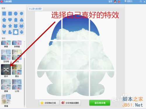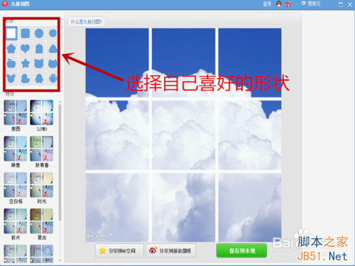 3、在九格切图界面,形状处可以选择你喜欢的拼图图案,我选择的是QQ企鹅的图案哦