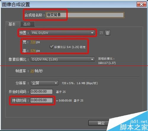 2、新建合成组,使用基础参数即可(如果各位使用的参数与我不同也无大碍)。