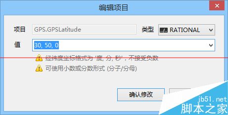 2、在弹出的窗口中输入新的纬度,注意要按照“度, 分, 秒”的格式输入,比如北纬30度50分则输入“30, 50, 0”,然后点击“确认编辑”来应用。